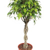 De ficus, groen en rijk aan bladeren, op een sierlijke gevlochten stam