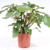 Aan de fraaie rode stelen van de Homalomena rubescens ‘Maggy’ bevinden zich grote hartvormige bladeren.